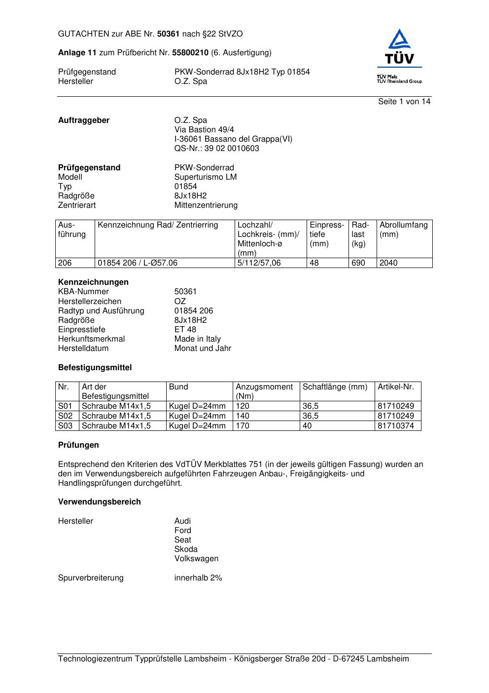 Felgengutachten / abe für Alufelgen O.Z. Spa 01854 (ET 0, Mittenloch 0 mm) mit KBA 50361 (Zertifikatsnummer 50361). Hier kostenlos als PDF herunterladen. Der Download-Link ist 24 Stunden gültig und kann bis zu zwei Mal verwendet werden.