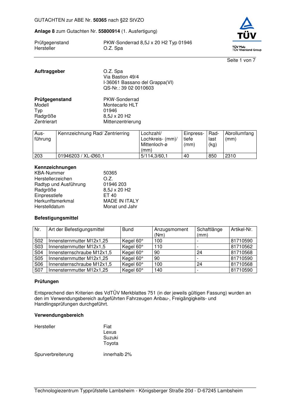 Dieses Gutachten (abe) bezieht sich auf die Alufelge O.Z. Spa 01946 in der Ausführung ET 0, Mittenloch 0 mm (KBA 50365). Im PDF findest du typischerweise zulässige Reifengrößen, Auflagen/Anbauhinweise und – je nach Dokument – Hinweise zur Eintragung.