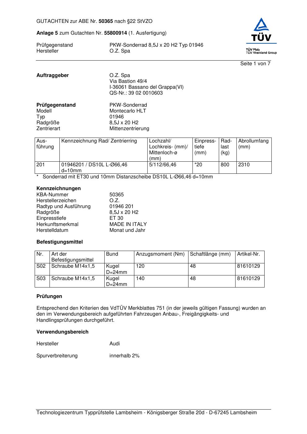 Dieses Gutachten (abe) bezieht sich auf die Alufelge O.Z. Spa 01946 in der Ausführung ET 0, Mittenloch 0 mm (KBA 50365). Im PDF findest du typischerweise zulässige Reifengrößen, Auflagen/Anbauhinweise und – je nach Dokument – Hinweise zur Eintragung.