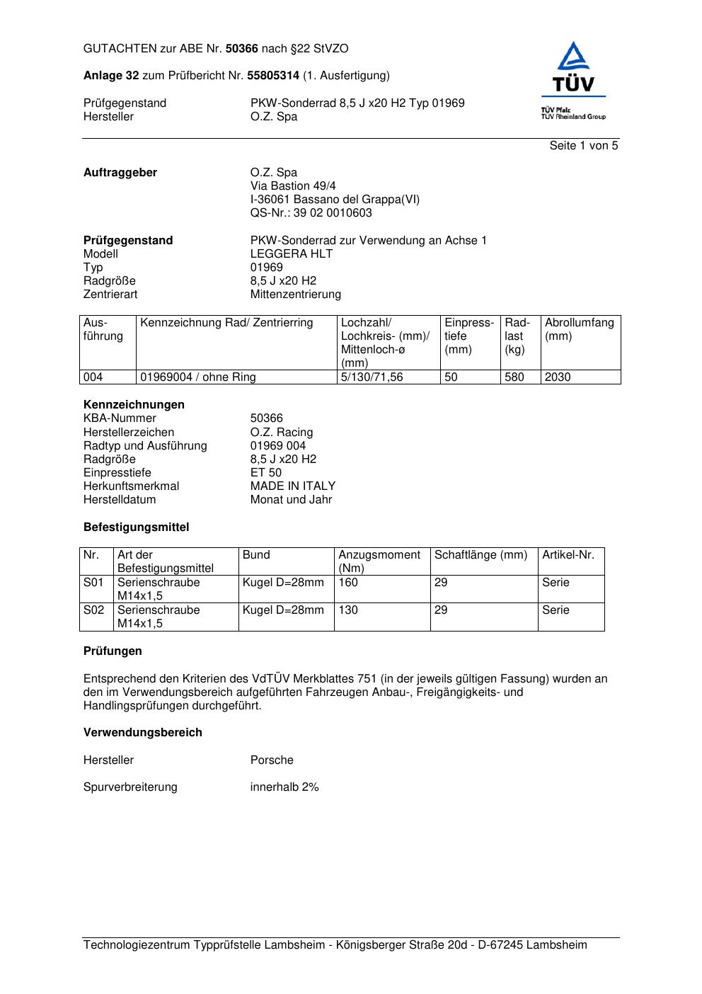 Dieses Gutachten (abe) bezieht sich auf die Alufelge O.Z. Spa 01969 in der Ausführung ET 0, Mittenloch 0 mm (KBA 50366). Im PDF findest du typischerweise zulässige Reifengrößen, Auflagen/Anbauhinweise und – je nach Dokument – Hinweise zur Eintragung.