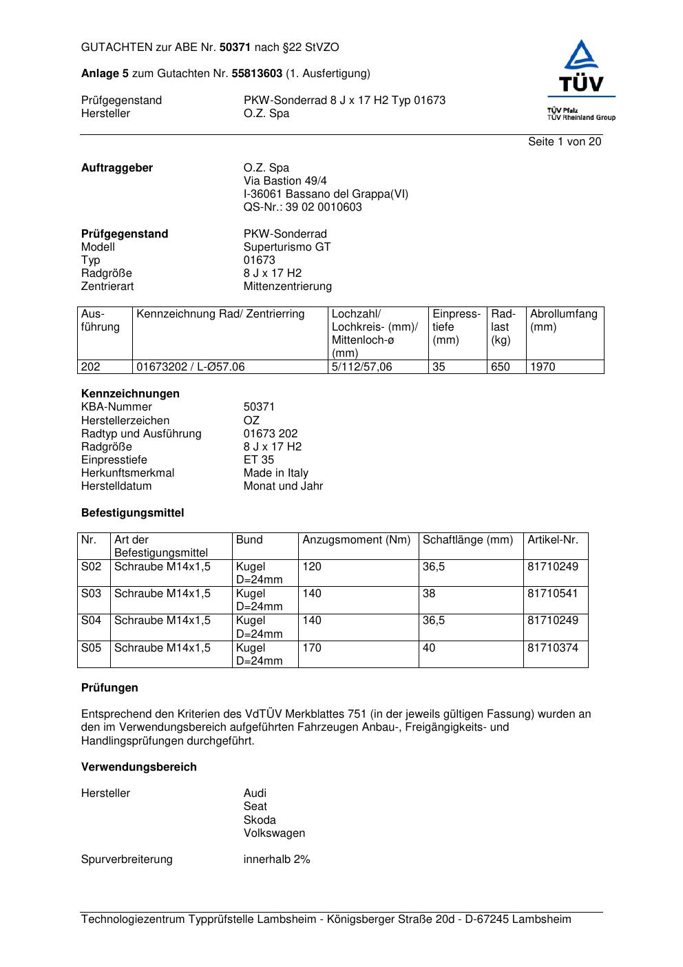 Felgengutachten / abe für Alufelgen O.Z. Spa 01673 (ET 0, Mittenloch 0 mm) mit KBA 50371 (Zertifikatsnummer 50371). Hier kostenlos als PDF herunterladen. Der Download-Link ist 24 Stunden gültig und kann bis zu zwei Mal verwendet werden.