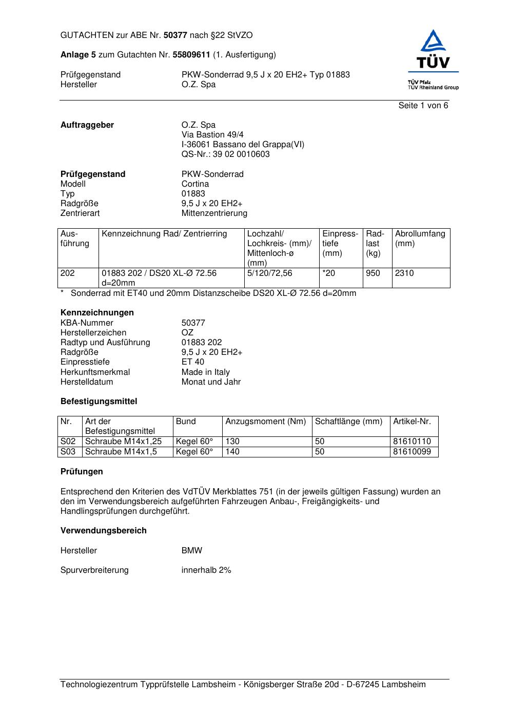 Felgengutachten / abe für Alufelgen O.Z. Spa 01883 (ET 0, Mittenloch 0 mm) mit KBA 50377 (Zertifikatsnummer 50377). Hier kostenlos als PDF herunterladen. Der Download-Link ist 24 Stunden gültig und kann bis zu zwei Mal verwendet werden.