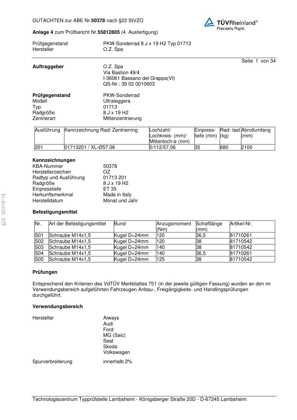 Dieses Gutachten (abe) bezieht sich auf die Alufelge O.Z. Spa 01713 in der Ausführung ET 0, Mittenloch 0 mm (KBA 50378). Im PDF findest du typischerweise zulässige Reifengrößen, Auflagen/Anbauhinweise und – je nach Dokument – Hinweise zur Eintragung.