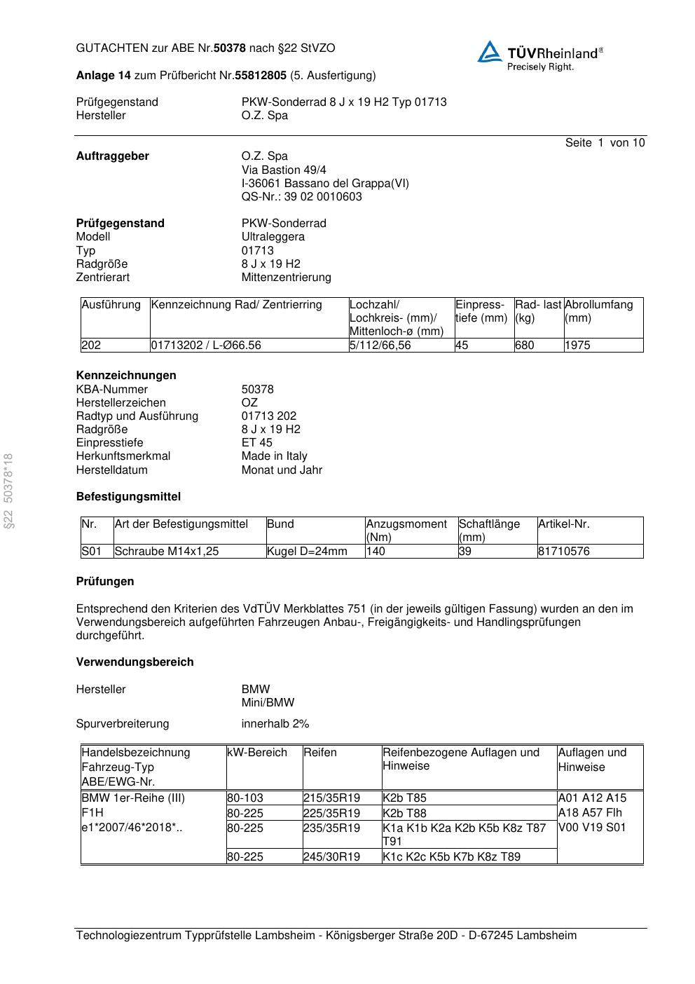 Dieses Gutachten (abe) bezieht sich auf die Alufelge O.Z. Spa 01713 in der Ausführung ET 0, Mittenloch 0 mm (KBA 50378). Im PDF findest du typischerweise zulässige Reifengrößen, Auflagen/Anbauhinweise und – je nach Dokument – Hinweise zur Eintragung.