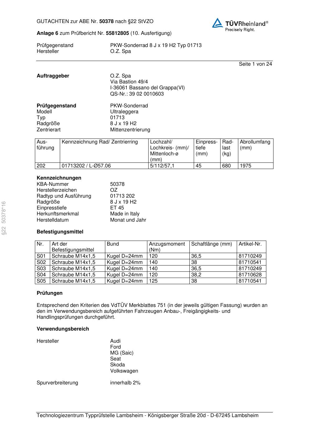 Dieses Gutachten (abe) bezieht sich auf die Alufelge O.Z. Spa 01713 in der Ausführung ET 0, Mittenloch 0 mm (KBA 50378). Im PDF findest du typischerweise zulässige Reifengrößen, Auflagen/Anbauhinweise und – je nach Dokument – Hinweise zur Eintragung.