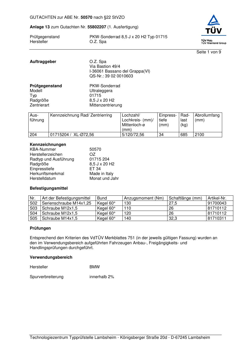 Dieses Gutachten (abe) bezieht sich auf die Alufelge O.Z. Spa 0171 5 in der Ausführung ET 0, Mittenloch 0 mm (KBA 50570). Im PDF findest du typischerweise zulässige Reifengrößen, Auflagen/Anbauhinweise und – je nach Dokument – Hinweise zur Eintragung.