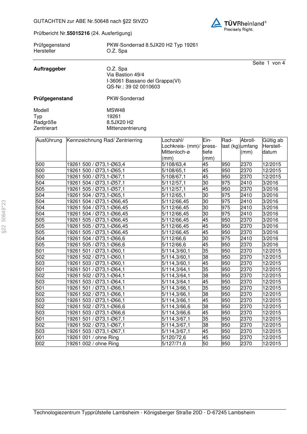 Felgengutachten / abe für Alufelgen O.Z. Spa 19261 (ET 0, Mittenloch 0 mm) mit KBA 50648 (Zertifikatsnummer 50648). Hier kostenlos als PDF herunterladen. Der Download-Link ist 24 Stunden gültig und kann bis zu zwei Mal verwendet werden.
