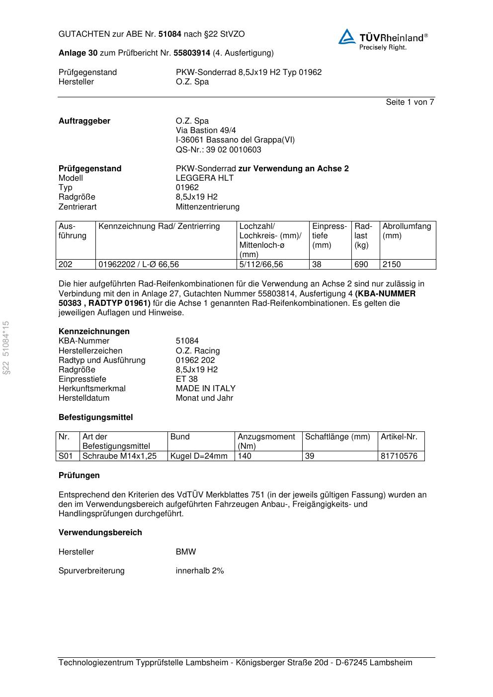 Dieses Gutachten (abe) bezieht sich auf die Alufelge O.Z. Spa (O.Z. Racing) 01962 in der Ausführung ET 0, Mittenloch 0 mm (KBA 51084). Im PDF findest du typischerweise zulässige Reifengrößen, Auflagen/Anbauhinweise und – je nach Dokument – Hinweise zur Eintragung.