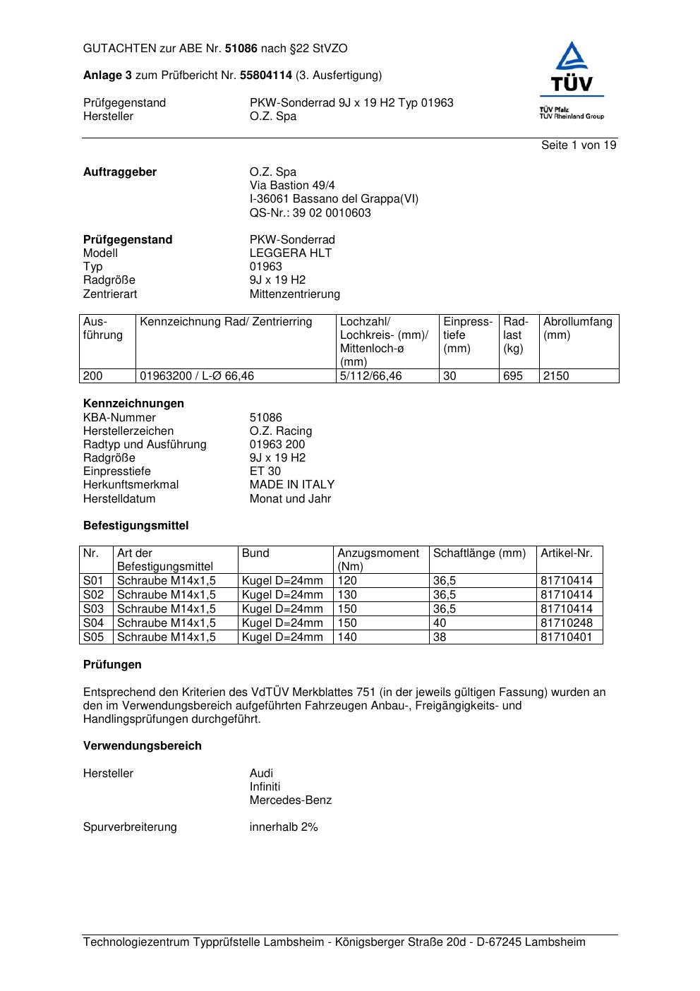 Felgengutachten / abe für Alufelgen O.Z. Spa 01963 (ET 0, Mittenloch 0 mm) mit KBA 51086 (Zertifikatsnummer 51086). Hier kostenlos als PDF herunterladen. Der Download-Link ist 24 Stunden gültig und kann bis zu zwei Mal verwendet werden.