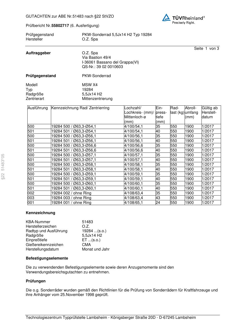 Dieses Gutachten (abe) bezieht sich auf die Alufelge O.Z. Spa 19284 in der Ausführung ET 0, Mittenloch 0 mm (KBA 51483). Im PDF findest du typischerweise zulässige Reifengrößen, Auflagen/Anbauhinweise und – je nach Dokument – Hinweise zur Eintragung.