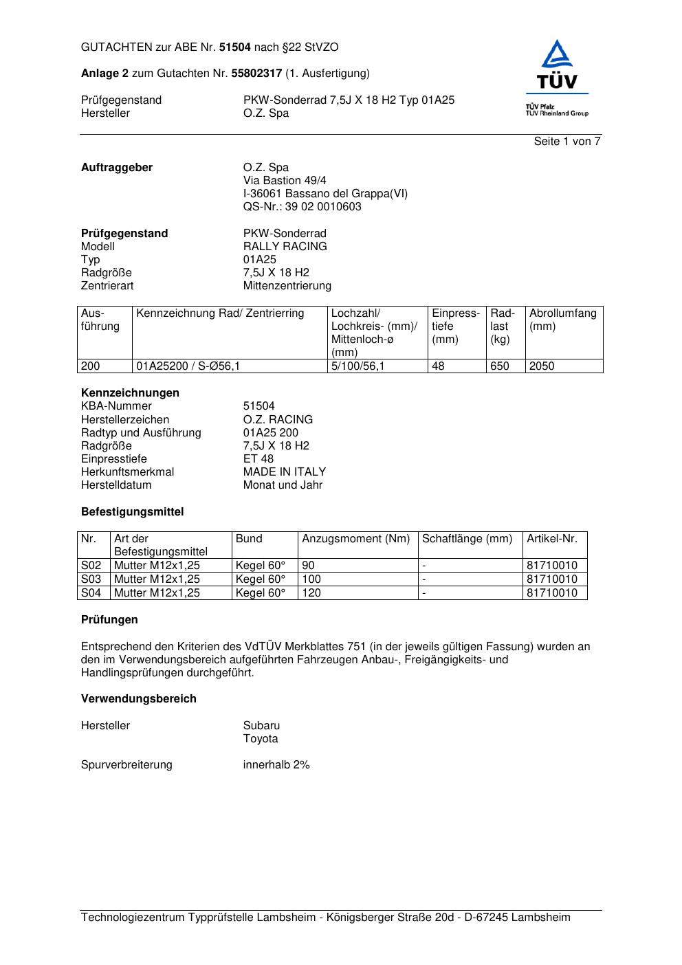 Dieses Gutachten (abe) bezieht sich auf die Alufelge O.Z. Spa 01A25 in der Ausführung ET 0, Mittenloch 0 mm (KBA 51504). Im PDF findest du typischerweise zulässige Reifengrößen, Auflagen/Anbauhinweise und – je nach Dokument – Hinweise zur Eintragung.