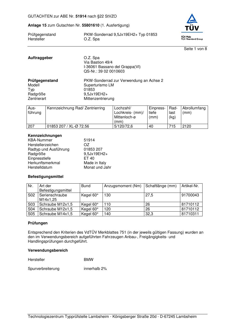 Dieses Gutachten (abe) bezieht sich auf die Alufelge O.Z. Spa 01853 in der Ausführung ET 0, Mittenloch 0 mm (KBA 51914). Im PDF findest du typischerweise zulässige Reifengrößen, Auflagen/Anbauhinweise und – je nach Dokument – Hinweise zur Eintragung.