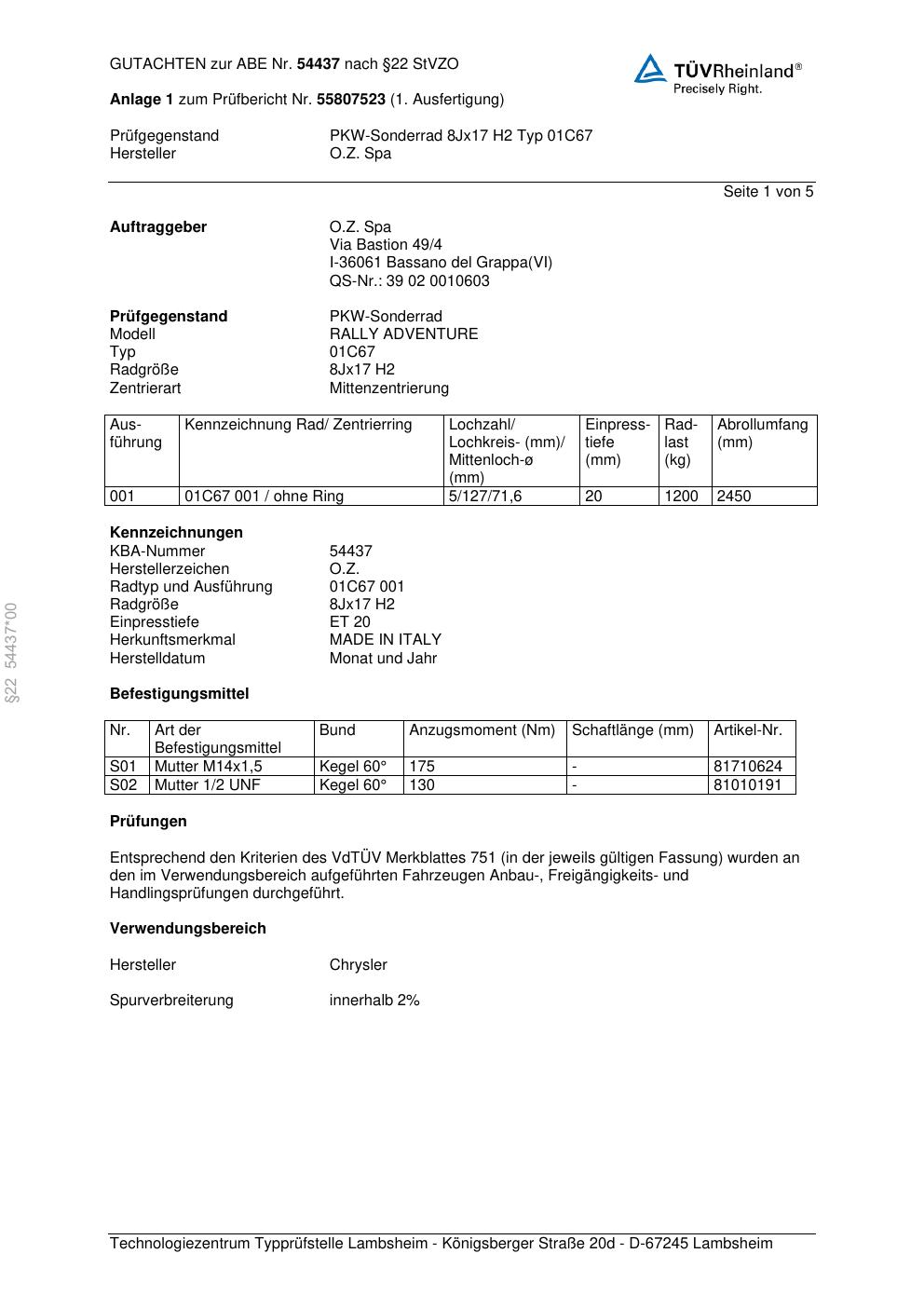 Dieses Gutachten (abe) bezieht sich auf die Alufelge O.Z. Spa 01C67 in der Ausführung ET 0, Mittenloch 0 mm (KBA 54437). Im PDF findest du typischerweise zulässige Reifengrößen, Auflagen/Anbauhinweise und – je nach Dokument – Hinweise zur Eintragung.
