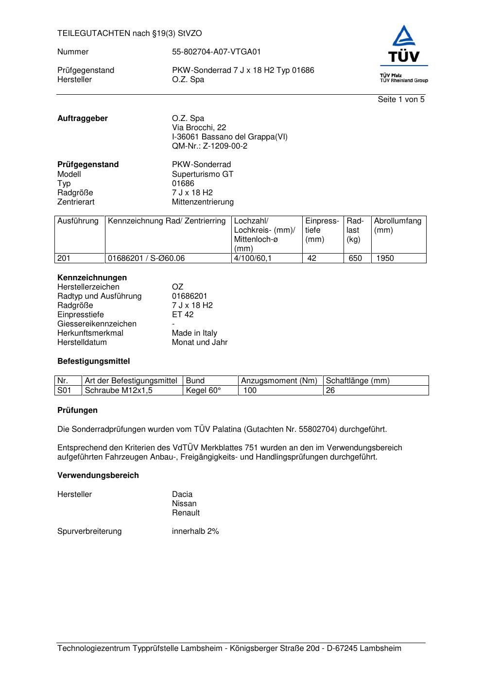 Felgengutachten / teilegutachten für Alufelgen O.Z. Spa 01686 (ET 0, Mittenloch 0 mm) (Zertifikatsnummer 55802704). Hier kostenlos als PDF herunterladen. Der Download-Link ist 24 Stunden gültig und kann bis zu zwei Mal verwendet werden.