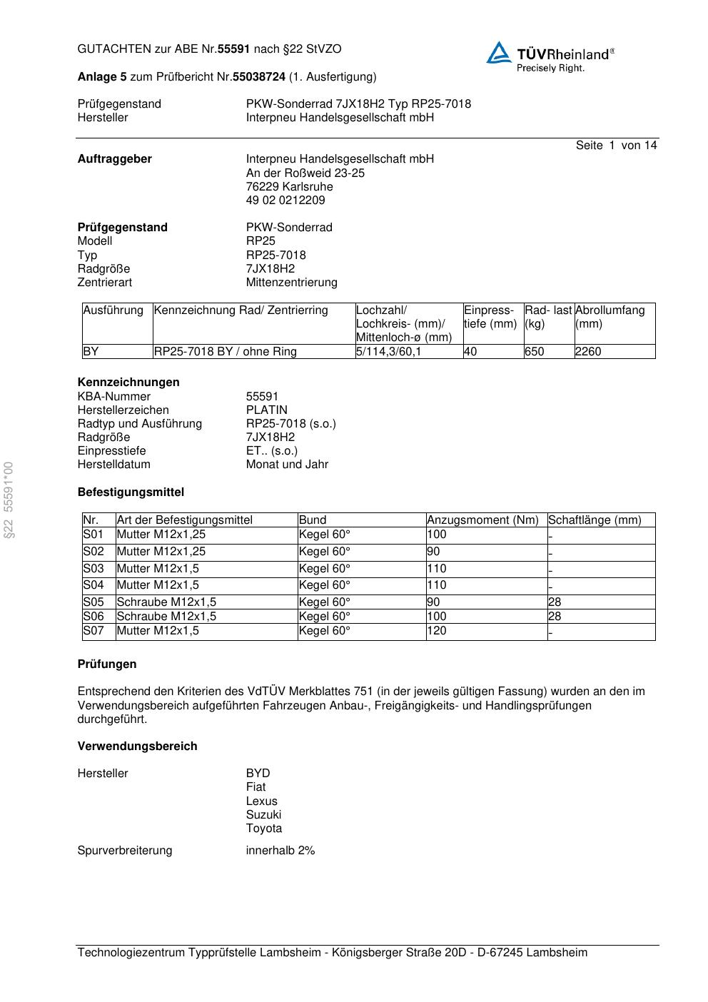 Dieses Gutachten (ABE) bezieht sich auf die Alufelge Platin P115 in der Ausführung 7Jx18 ET 0, Mittenloch 0 mm (KBA 55591). Im PDF findest du typischerweise zulässige Reifengrößen, Auflagen/Anbauhinweise und – je nach Dokument – Hinweise zur Eintragung.