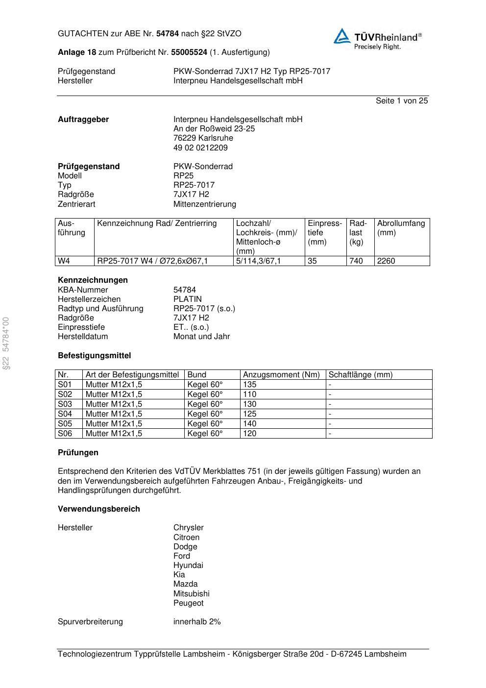 Dieses Gutachten (ABE) bezieht sich auf die Alufelge Platin P115 in der Ausführung 7Jx17 ET 0, Mittenloch 0 mm (KBA 54784). Im PDF findest du typischerweise zulässige Reifengrößen, Auflagen/Anbauhinweise und – je nach Dokument – Hinweise zur Eintragung.