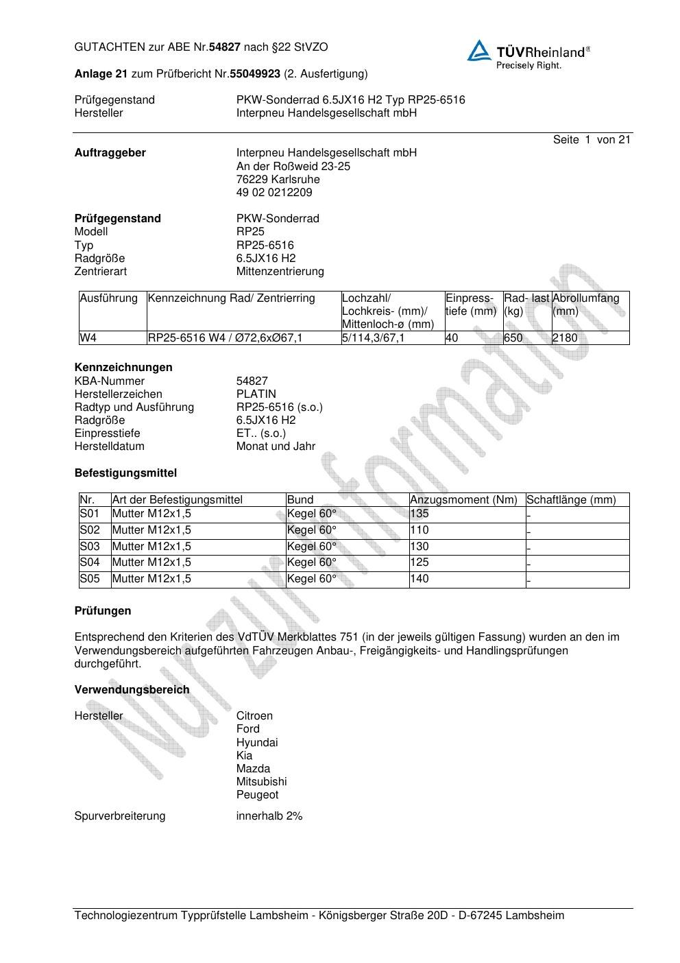Felgengutachten / ABE für Alufelgen Platin P115 (6.5Jx16 ET 0, Mittenloch 0 mm) mit KBA 54827 (Zertifikatsnummer 00461125). Hier kostenlos als PDF herunterladen. Der Download-Link ist 24 Stunden gültig und kann bis zu zwei Mal verwendet werden.