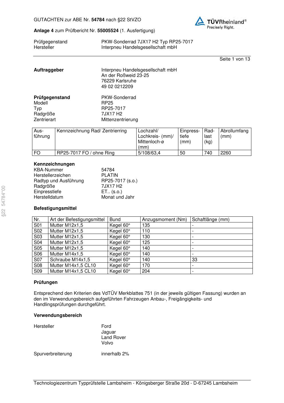 Dieses Gutachten (ABE) bezieht sich auf die Alufelge Platin P115 in der Ausführung 7Jx17 ET 0, Mittenloch 0 mm (KBA 54784). Im PDF findest du typischerweise zulässige Reifengrößen, Auflagen/Anbauhinweise und – je nach Dokument – Hinweise zur Eintragung.