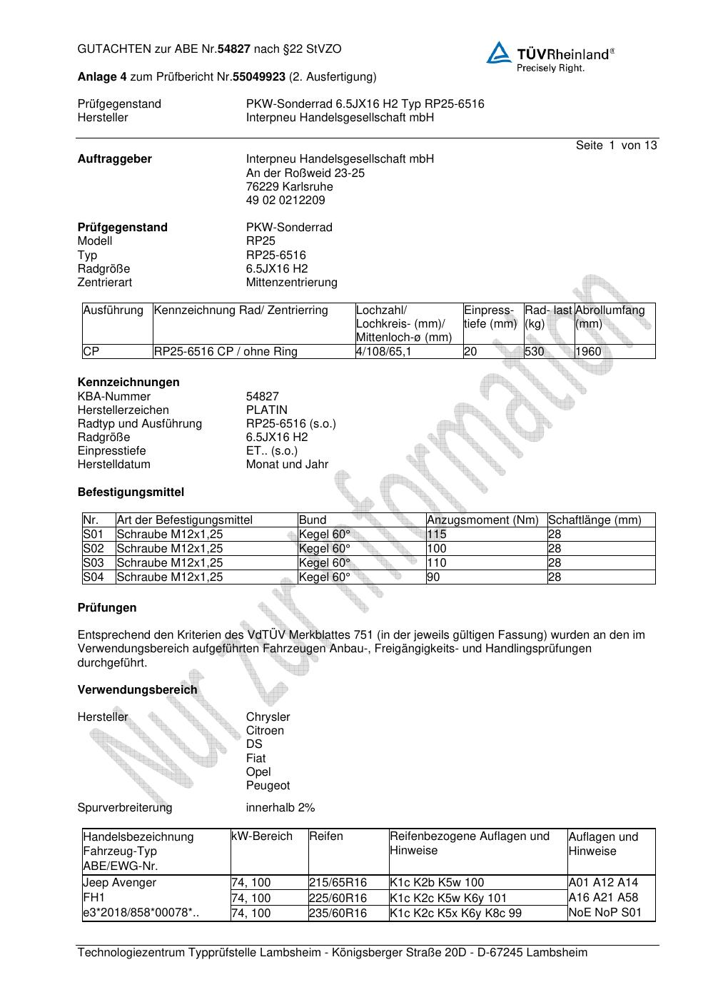 Dieses Gutachten (ABE) bezieht sich auf die Alufelge Platin P115 in der Ausführung 6.5Jx16 ET 0, Mittenloch 0 mm (KBA 54827). Im PDF findest du typischerweise zulässige Reifengrößen, Auflagen/Anbauhinweise und – je nach Dokument – Hinweise zur Eintragung.