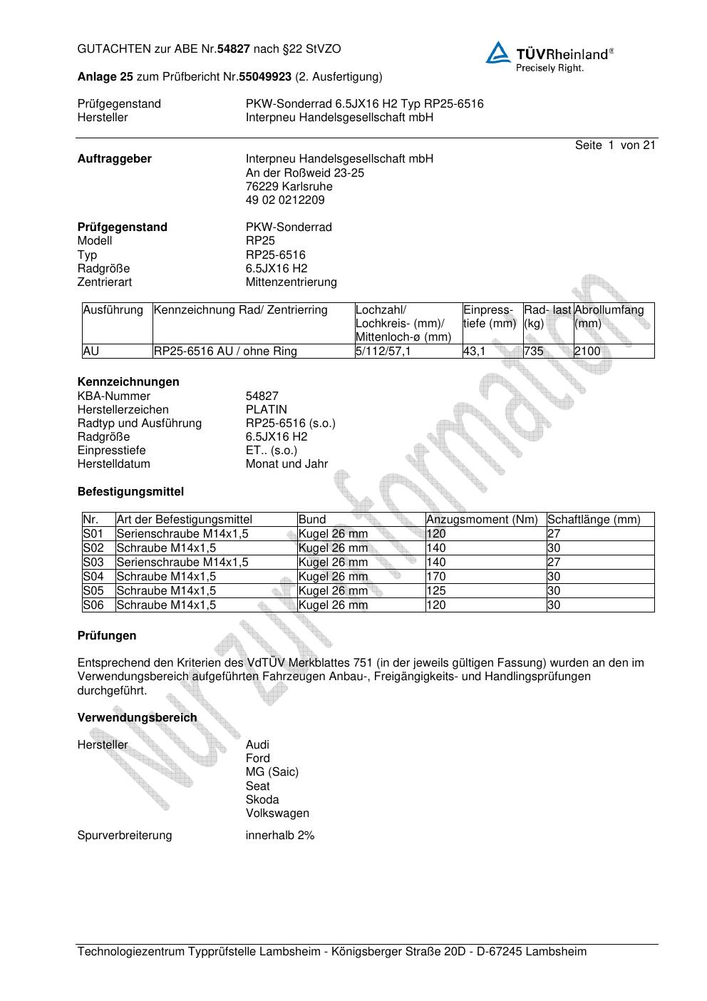 Dieses Gutachten (ABE) bezieht sich auf die Alufelge Platin P115 in der Ausführung 6.5Jx16 ET 0, Mittenloch 0 mm (KBA 54827). Im PDF findest du typischerweise zulässige Reifengrößen, Auflagen/Anbauhinweise und – je nach Dokument – Hinweise zur Eintragung.