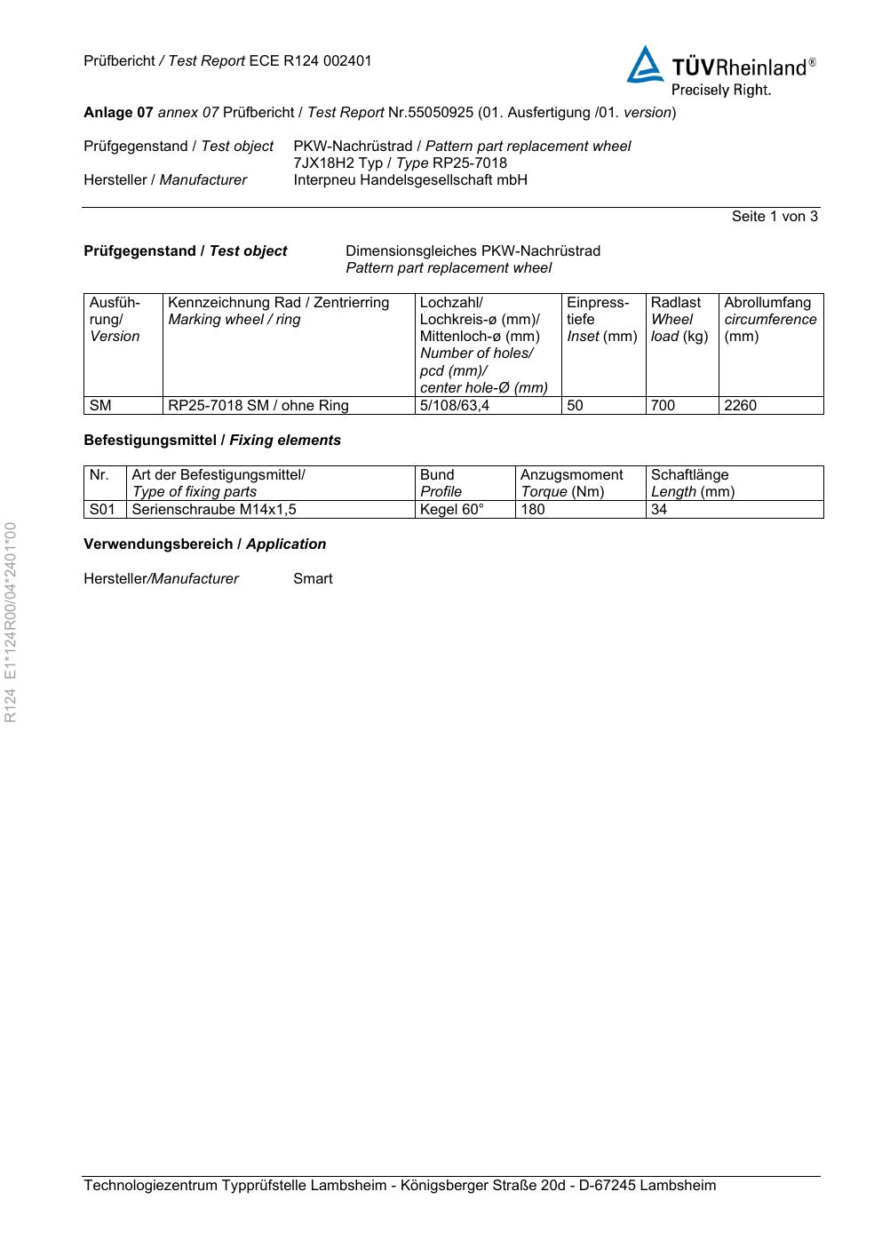 Dieses Gutachten (ABE) bezieht sich auf die Alufelge Platin P115 in der Ausführung 7Jx18 ET 0, Mittenloch 0 mm (KBA 55591). Im PDF findest du typischerweise zulässige Reifengrößen, Auflagen/Anbauhinweise und – je nach Dokument – Hinweise zur Eintragung.