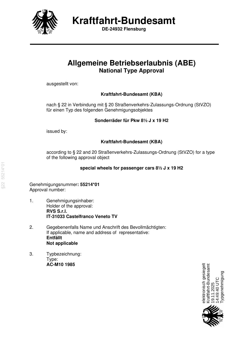 Dieses Gutachten (ABE) bezieht sich auf die Alufelge Platin P118 in der Ausführung 8.5Jx19 ET 0, Mittenloch 0 mm (KBA 55214). Im PDF findest du typischerweise zulässige Reifengrößen, Auflagen/Anbauhinweise und – je nach Dokument – Hinweise zur Eintragung.