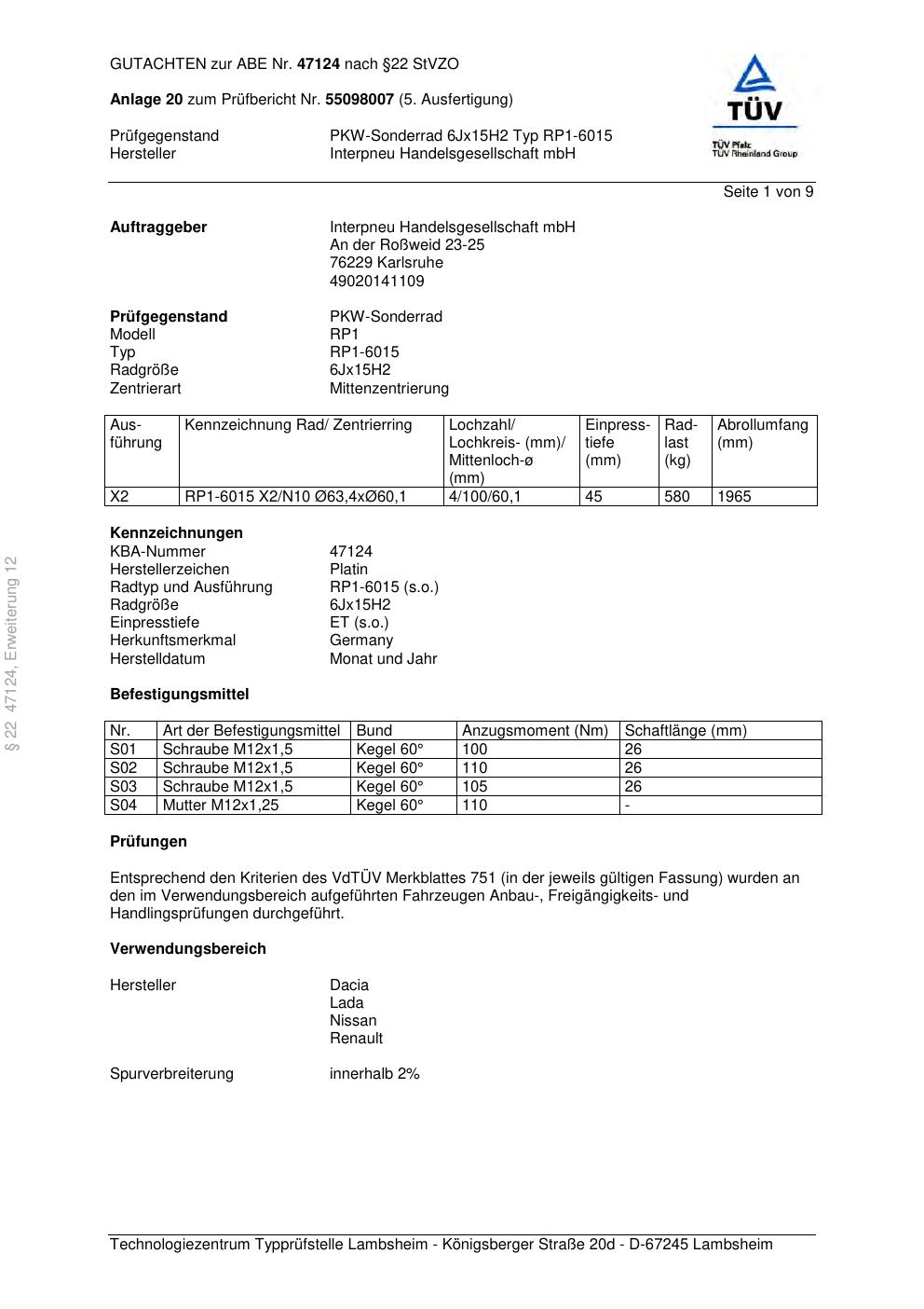 Dieses Gutachten (ABE) bezieht sich auf die Alufelge Platin P53 in der Ausführung 6Jx15 ET 0, Mittenloch 0 mm (KBA 47124). Im PDF findest du typischerweise zulässige Reifengrößen, Auflagen/Anbauhinweise und – je nach Dokument – Hinweise zur Eintragung.
