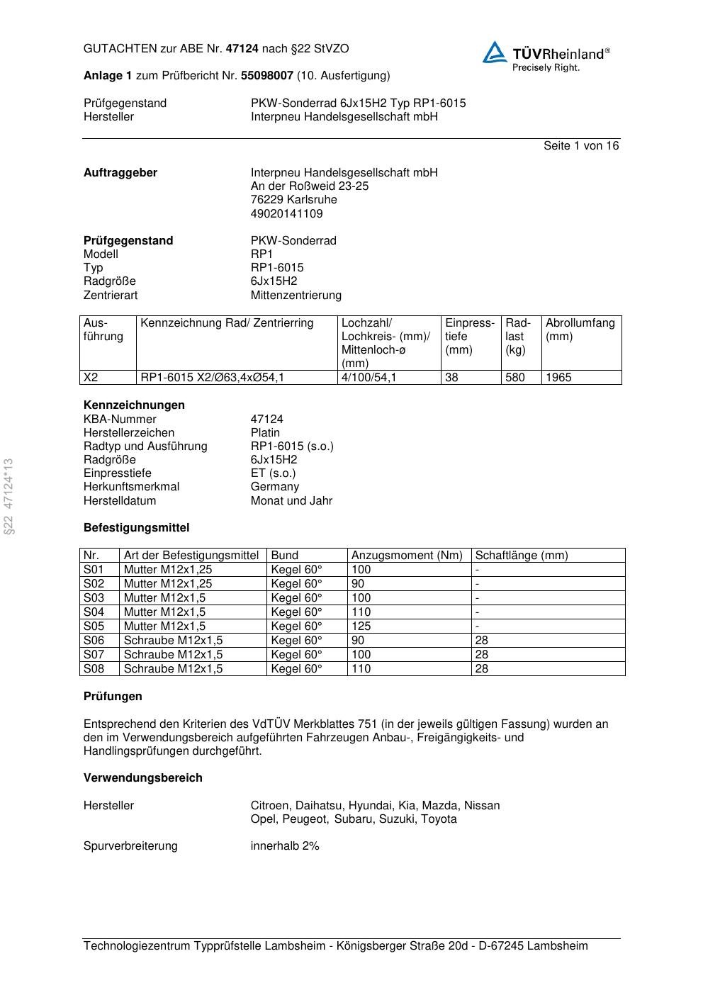 Dieses Gutachten (ABE) bezieht sich auf die Alufelge Platin P53 in der Ausführung 6Jx15 ET 0, Mittenloch 0 mm (KBA 47124). Im PDF findest du typischerweise zulässige Reifengrößen, Auflagen/Anbauhinweise und – je nach Dokument – Hinweise zur Eintragung.