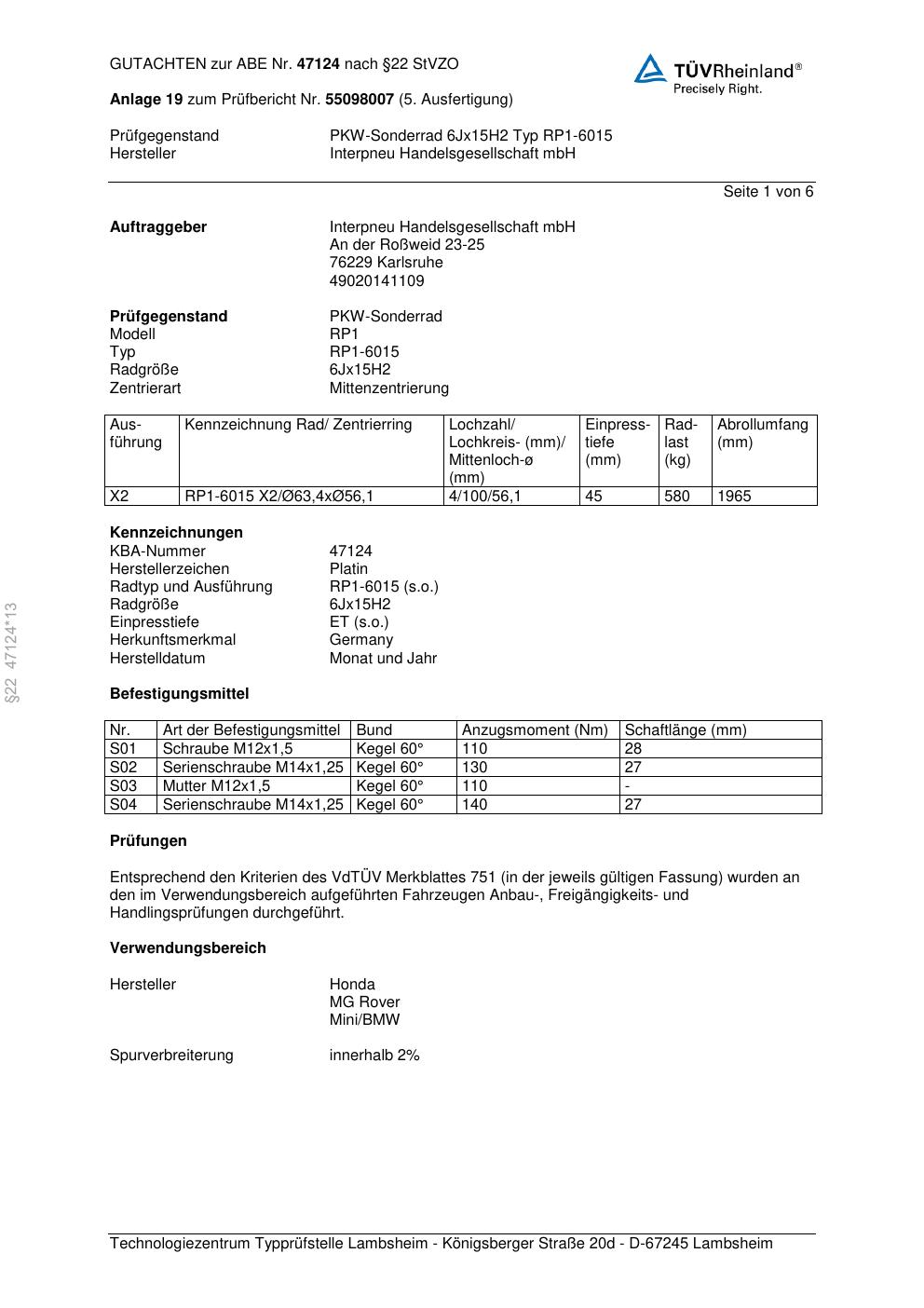 Dieses Gutachten (ABE) bezieht sich auf die Alufelge Platin P53 in der Ausführung 6Jx15 ET 0, Mittenloch 0 mm (KBA 47124). Im PDF findest du typischerweise zulässige Reifengrößen, Auflagen/Anbauhinweise und – je nach Dokument – Hinweise zur Eintragung.