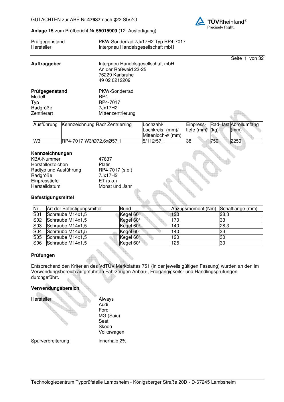 Dieses Gutachten (ABE) bezieht sich auf die Alufelge Platin P58 in der Ausführung 7Jx17 ET 0, Mittenloch 0 mm (KBA 47637). Im PDF findest du typischerweise zulässige Reifengrößen, Auflagen/Anbauhinweise und – je nach Dokument – Hinweise zur Eintragung.