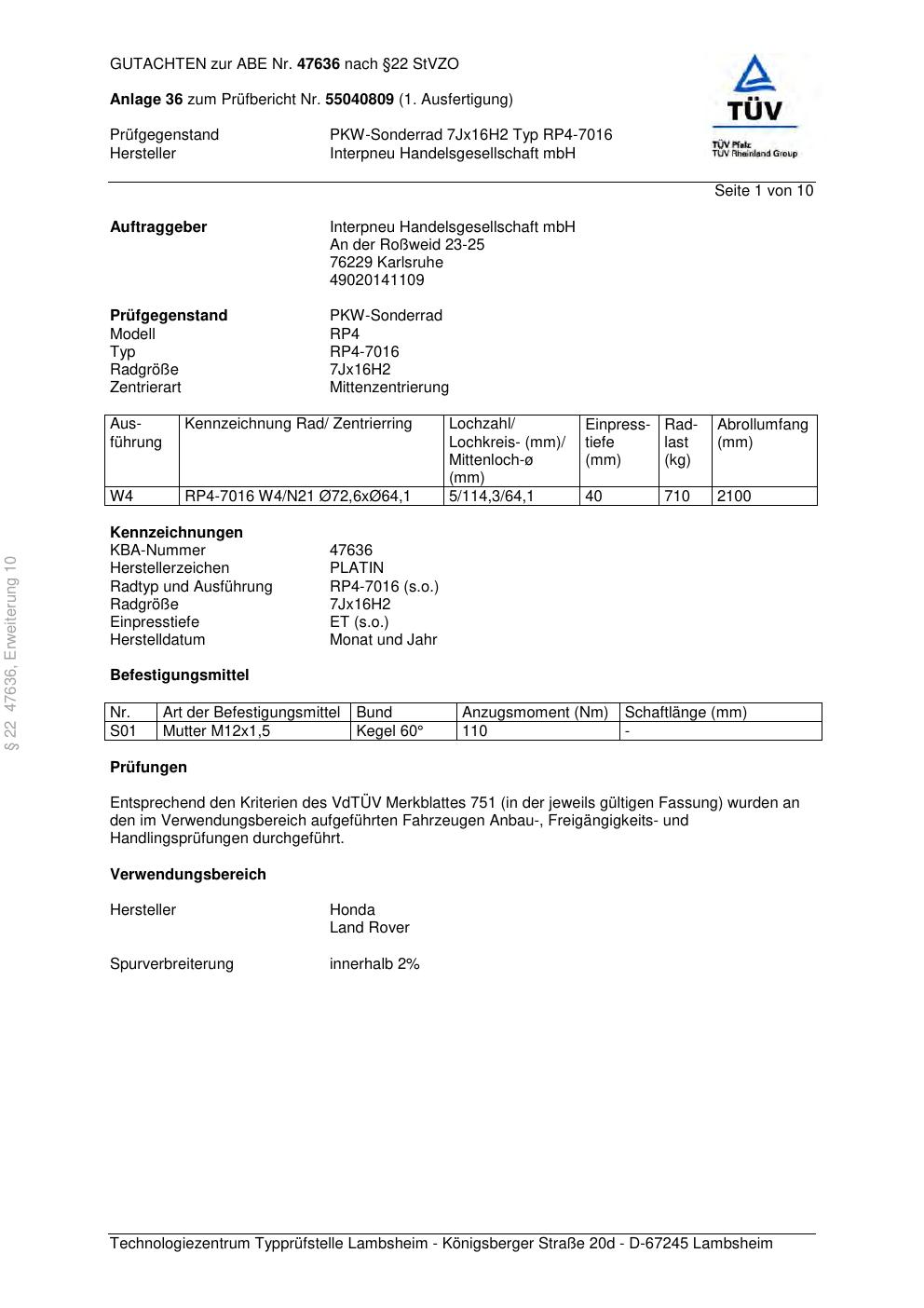 Dieses Gutachten (ABE) bezieht sich auf die Alufelge Platin P58 in der Ausführung 7Jx16 ET 0, Mittenloch 0 mm (KBA 47636). Im PDF findest du typischerweise zulässige Reifengrößen, Auflagen/Anbauhinweise und – je nach Dokument – Hinweise zur Eintragung.