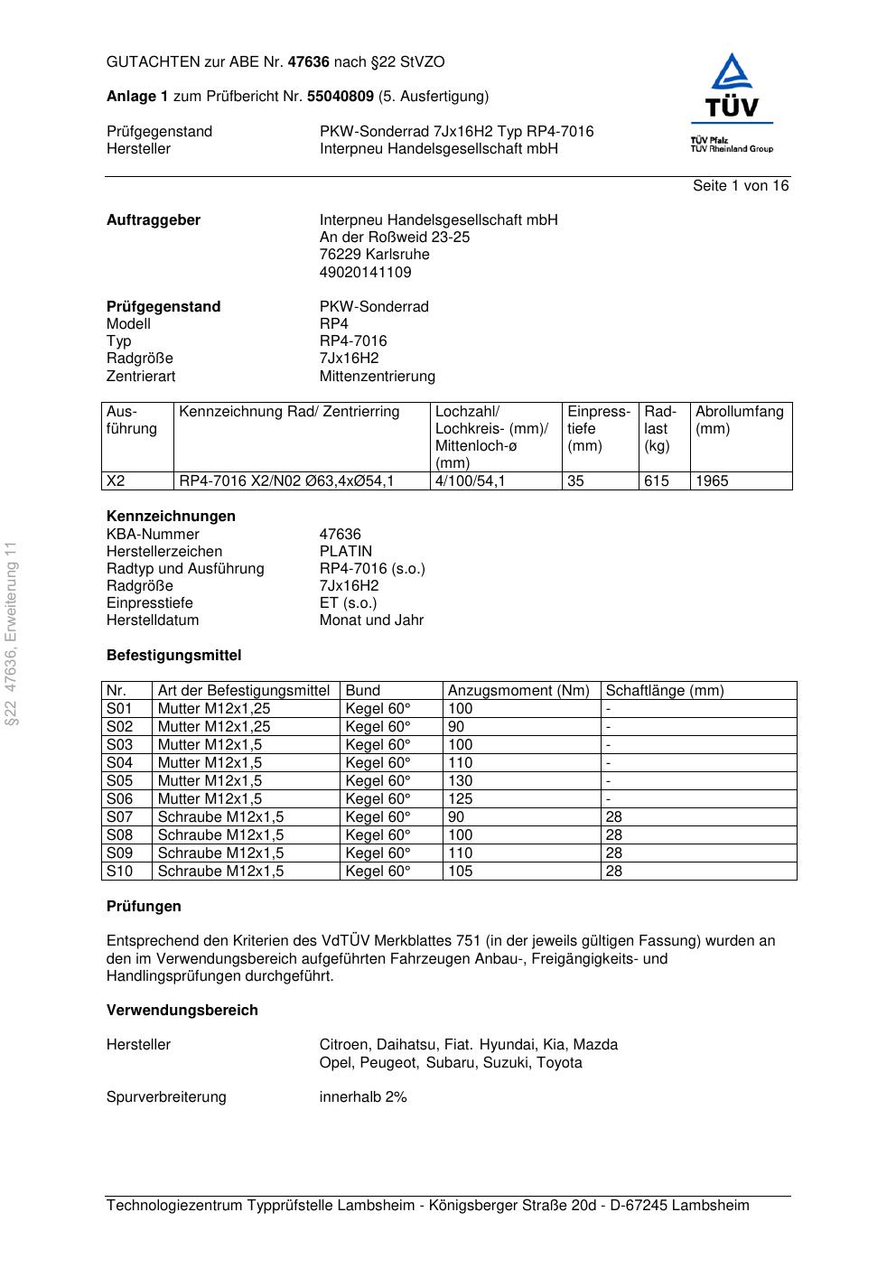 Dieses Gutachten (ABE) bezieht sich auf die Alufelge Platin P58 in der Ausführung 7Jx16 ET 0, Mittenloch 0 mm (KBA 47636). Im PDF findest du typischerweise zulässige Reifengrößen, Auflagen/Anbauhinweise und – je nach Dokument – Hinweise zur Eintragung.