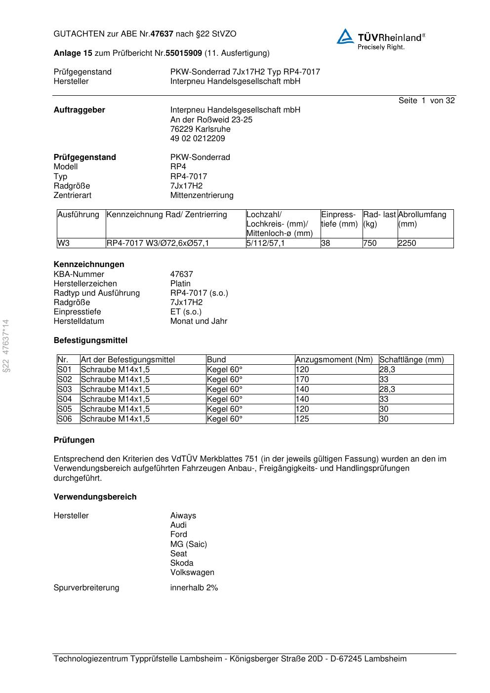 Dieses Gutachten (ABE) bezieht sich auf die Alufelge Platin P58 in der Ausführung 7Jx17 ET 0, Mittenloch 0 mm (KBA 47637). Im PDF findest du typischerweise zulässige Reifengrößen, Auflagen/Anbauhinweise und – je nach Dokument – Hinweise zur Eintragung.