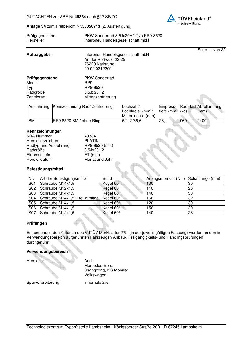 Dieses Gutachten (ABE) bezieht sich auf die Alufelge Platin P66 in der Ausführung 8.5Jx2 ET 0, Mittenloch 0 mm (KBA 49334). Im PDF findest du typischerweise zulässige Reifengrößen, Auflagen/Anbauhinweise und – je nach Dokument – Hinweise zur Eintragung.