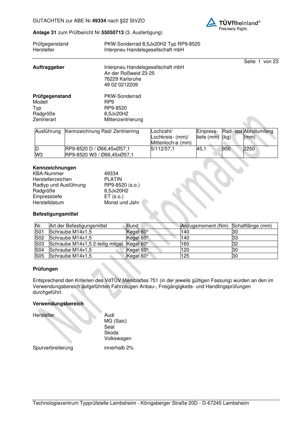Felgengutachten / ABE für Alufelgen Platin P66 (8.5Jx2 ET 0, Mittenloch 0 mm) mit KBA 49334 (Zertifikatsnummer 00455486). Hier kostenlos als PDF herunterladen. Der Download-Link ist 24 Stunden gültig und kann bis zu zwei Mal verwendet werden.