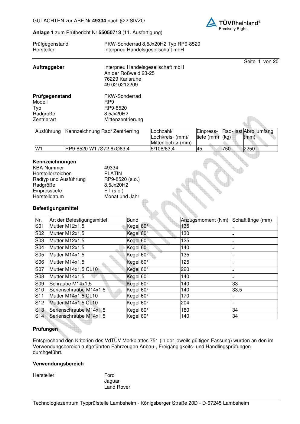 Dieses Gutachten (ABE) bezieht sich auf die Alufelge Platin P66 in der Ausführung 8.5Jx2 ET 0, Mittenloch 0 mm (KBA 49334). Im PDF findest du typischerweise zulässige Reifengrößen, Auflagen/Anbauhinweise und – je nach Dokument – Hinweise zur Eintragung.