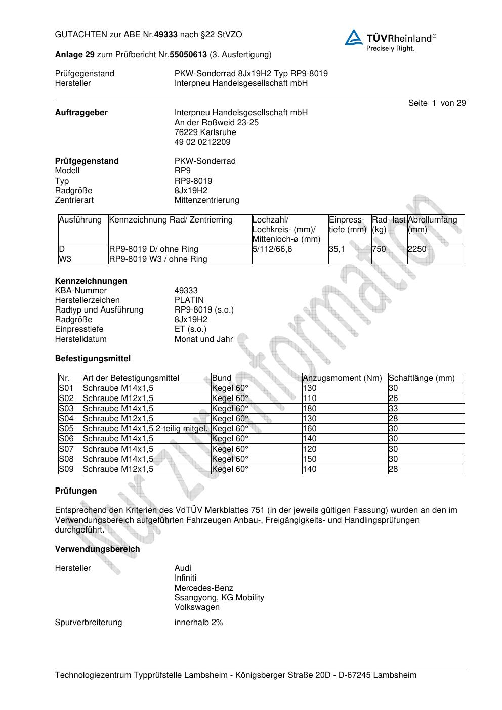 Dieses Gutachten (ABE) bezieht sich auf die Alufelge Platin P66 in der Ausführung 8Jx19 ET 0, Mittenloch 0 mm (KBA 49333). Im PDF findest du typischerweise zulässige Reifengrößen, Auflagen/Anbauhinweise und – je nach Dokument – Hinweise zur Eintragung.
