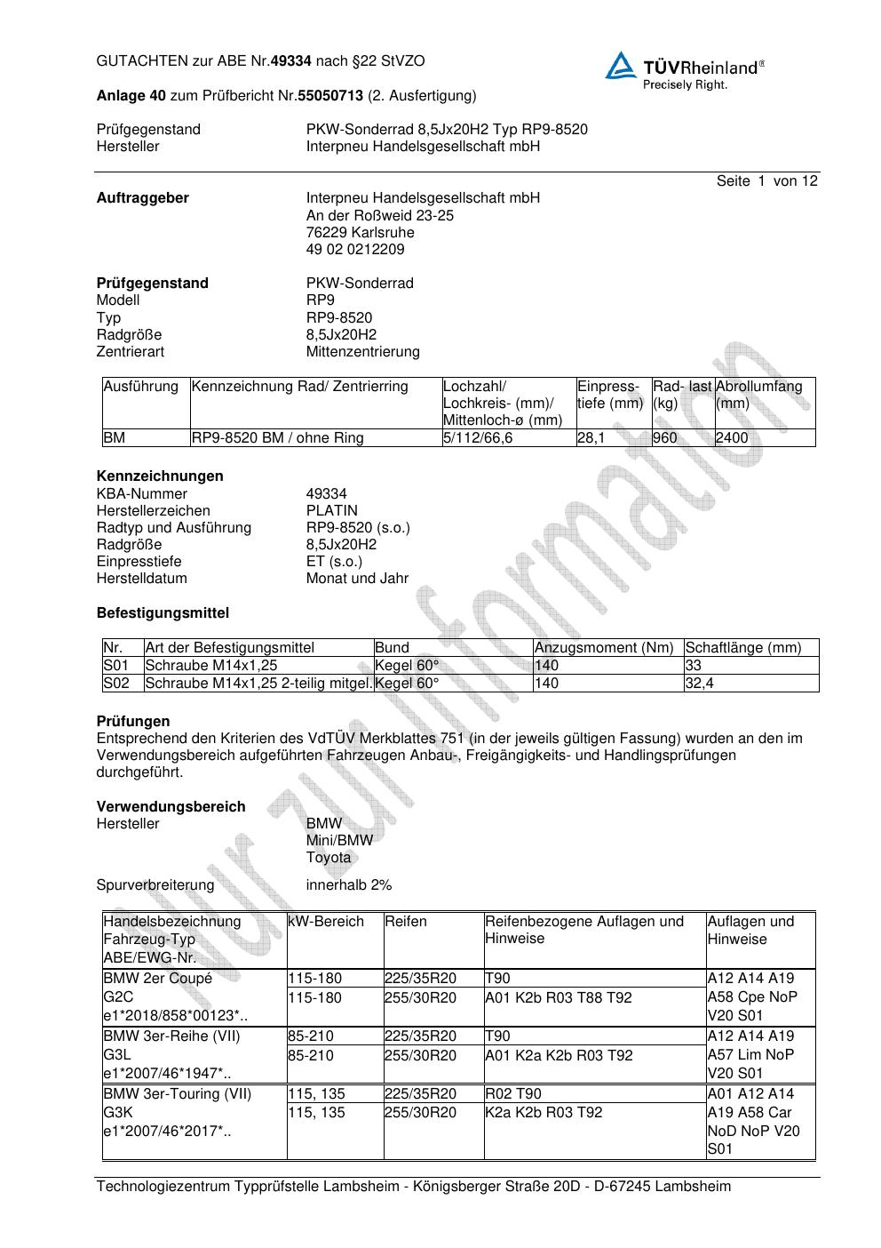 Dieses Gutachten (ABE) bezieht sich auf die Alufelge Platin P66 in der Ausführung 8.5Jx2 ET 0, Mittenloch 0 mm (KBA 49334). Im PDF findest du typischerweise zulässige Reifengrößen, Auflagen/Anbauhinweise und – je nach Dokument – Hinweise zur Eintragung.