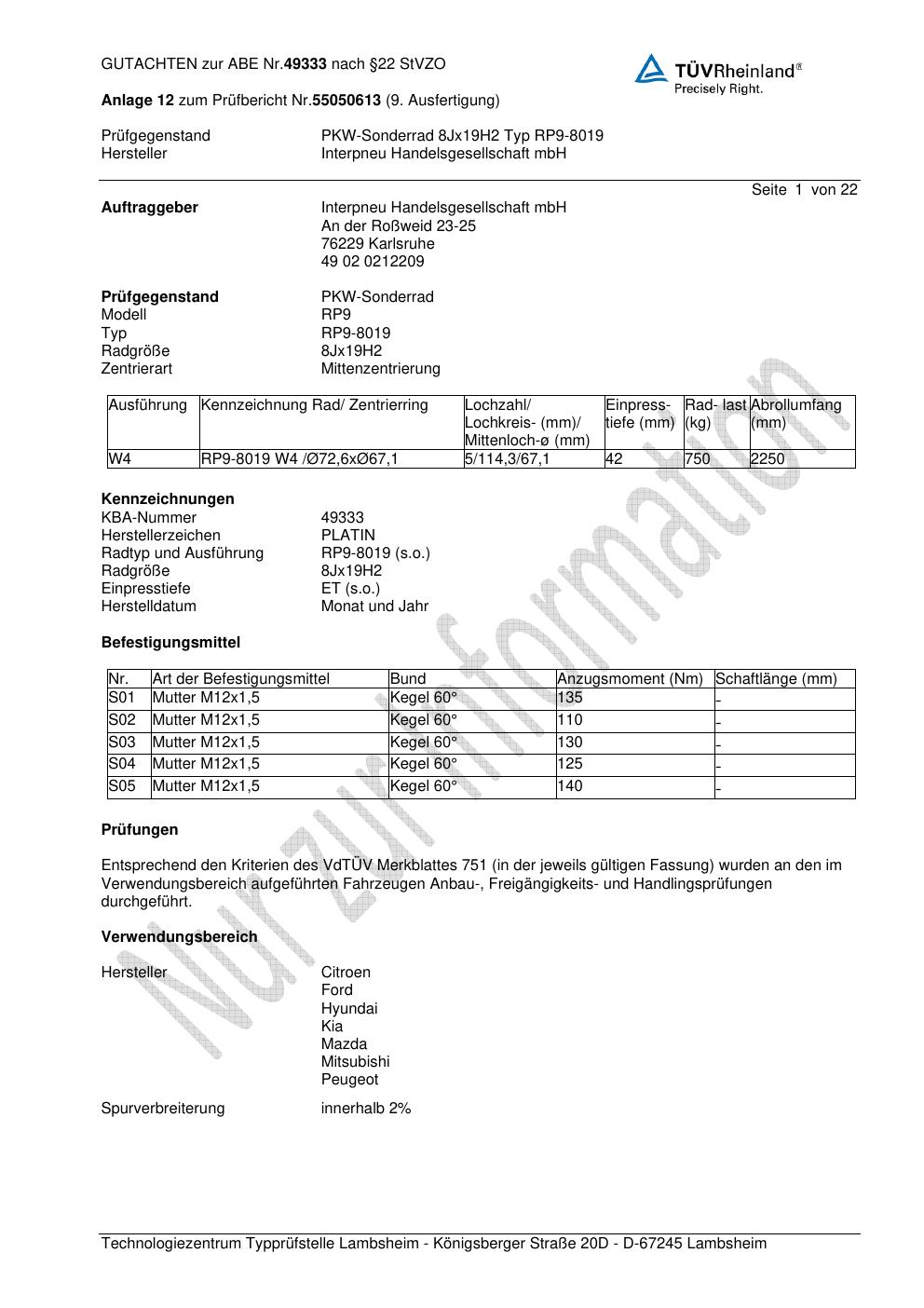 Dieses Gutachten (ABE) bezieht sich auf die Alufelge Platin P66 in der Ausführung 8Jx19 ET 0, Mittenloch 0 mm (KBA 49333). Im PDF findest du typischerweise zulässige Reifengrößen, Auflagen/Anbauhinweise und – je nach Dokument – Hinweise zur Eintragung.