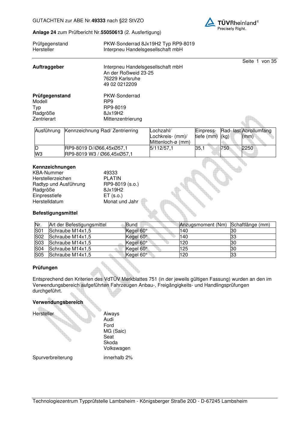 Dieses Gutachten (ABE) bezieht sich auf die Alufelge Platin P66 in der Ausführung 8Jx19 ET 0, Mittenloch 0 mm (KBA 49333). Im PDF findest du typischerweise zulässige Reifengrößen, Auflagen/Anbauhinweise und – je nach Dokument – Hinweise zur Eintragung.