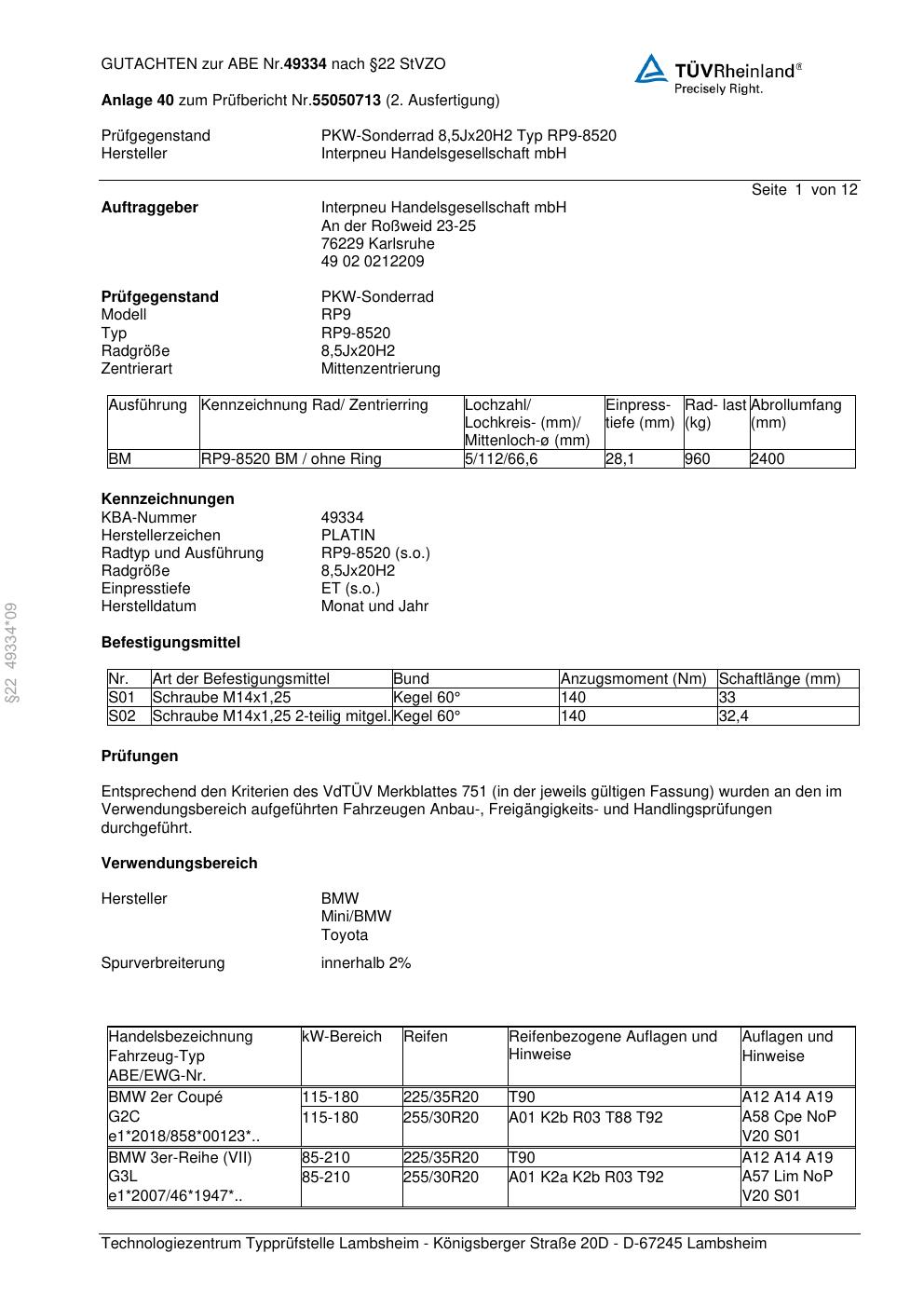 Dieses Gutachten (ABE) bezieht sich auf die Alufelge Platin P66 in der Ausführung 8.5Jx2 ET 0, Mittenloch 0 mm (KBA 49334). Im PDF findest du typischerweise zulässige Reifengrößen, Auflagen/Anbauhinweise und – je nach Dokument – Hinweise zur Eintragung.