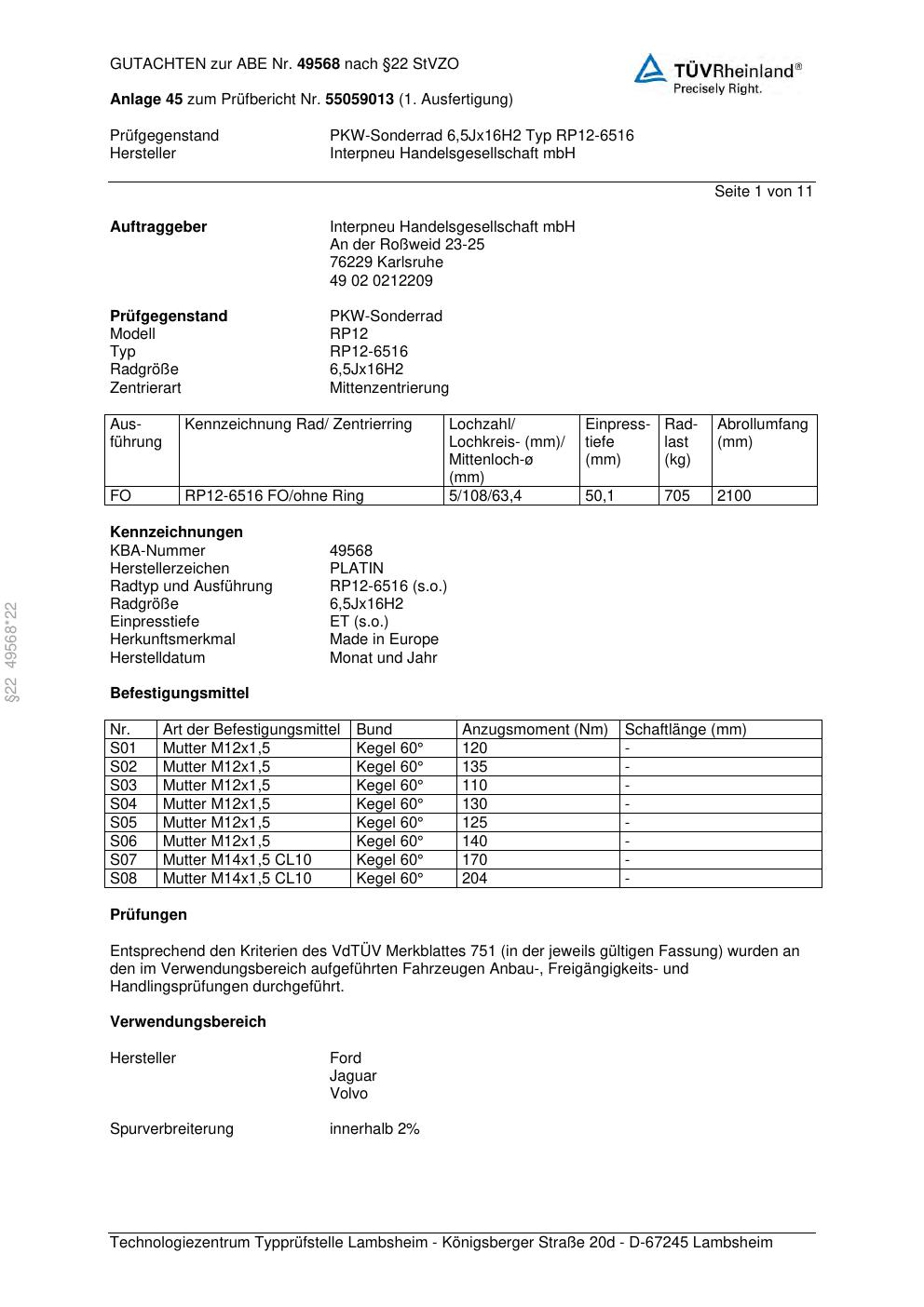 Dieses Gutachten (ABE) bezieht sich auf die Alufelge Platin P69 in der Ausführung 6.5Jx16 ET 0, Mittenloch 0 mm (KBA 49568). Im PDF findest du typischerweise zulässige Reifengrößen, Auflagen/Anbauhinweise und – je nach Dokument – Hinweise zur Eintragung.