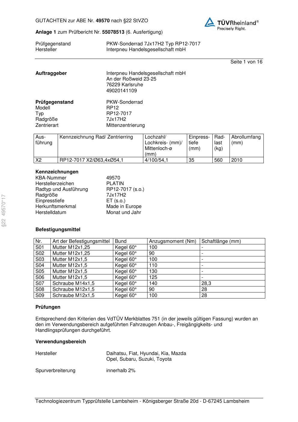 Dieses Gutachten (ABE) bezieht sich auf die Alufelge Platin P69 in der Ausführung 7Jx17 ET 0, Mittenloch 0 mm (KBA 49570). Im PDF findest du typischerweise zulässige Reifengrößen, Auflagen/Anbauhinweise und – je nach Dokument – Hinweise zur Eintragung.