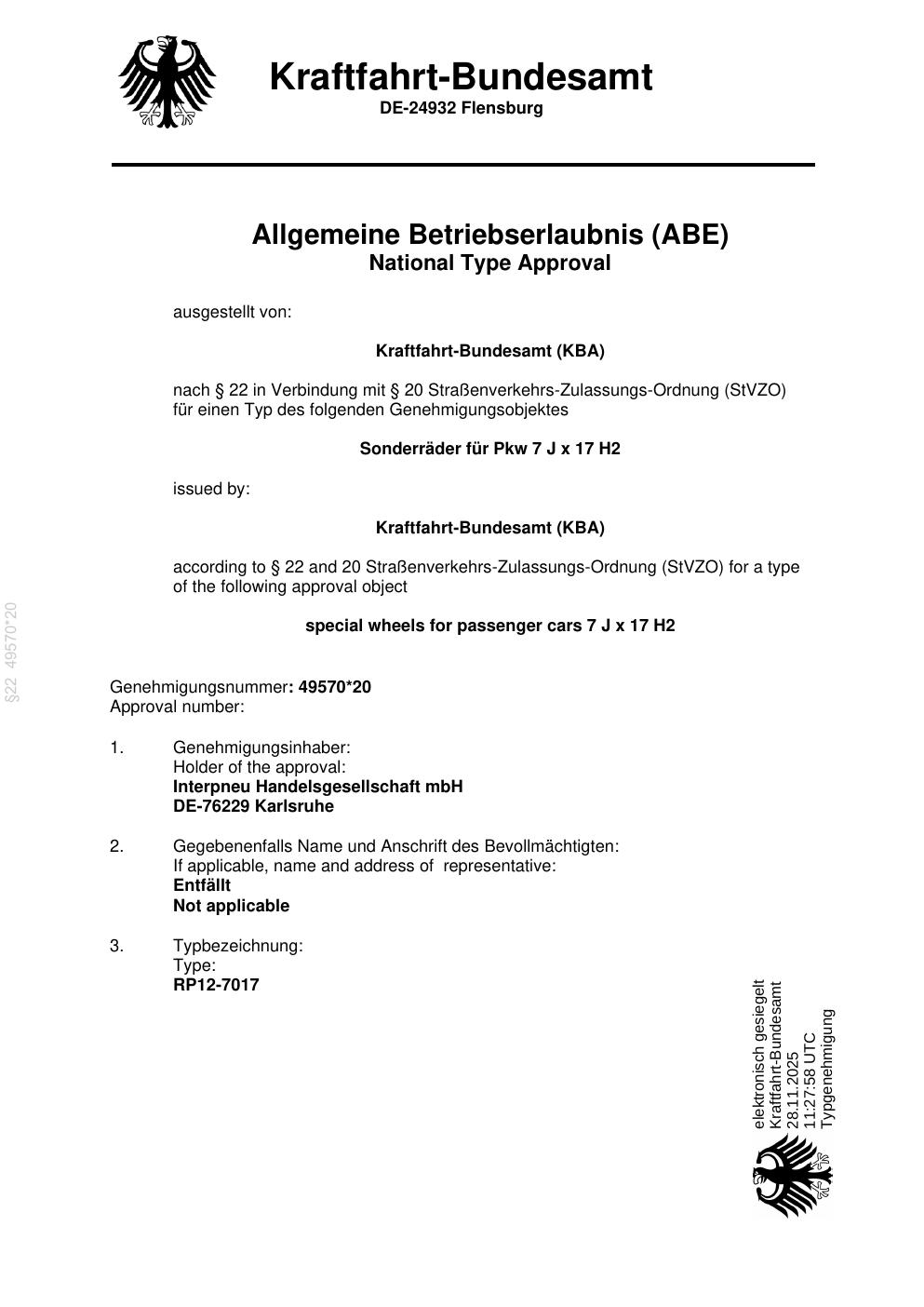 Felgengutachten / ABE für Alufelgen Platin P69 (7Jx17 ET 0, Mittenloch 0 mm) mit KBA 49570 (Zertifikatsnummer 00458826). Hier kostenlos als PDF herunterladen. Der Download-Link ist 24 Stunden gültig und kann bis zu zwei Mal verwendet werden.