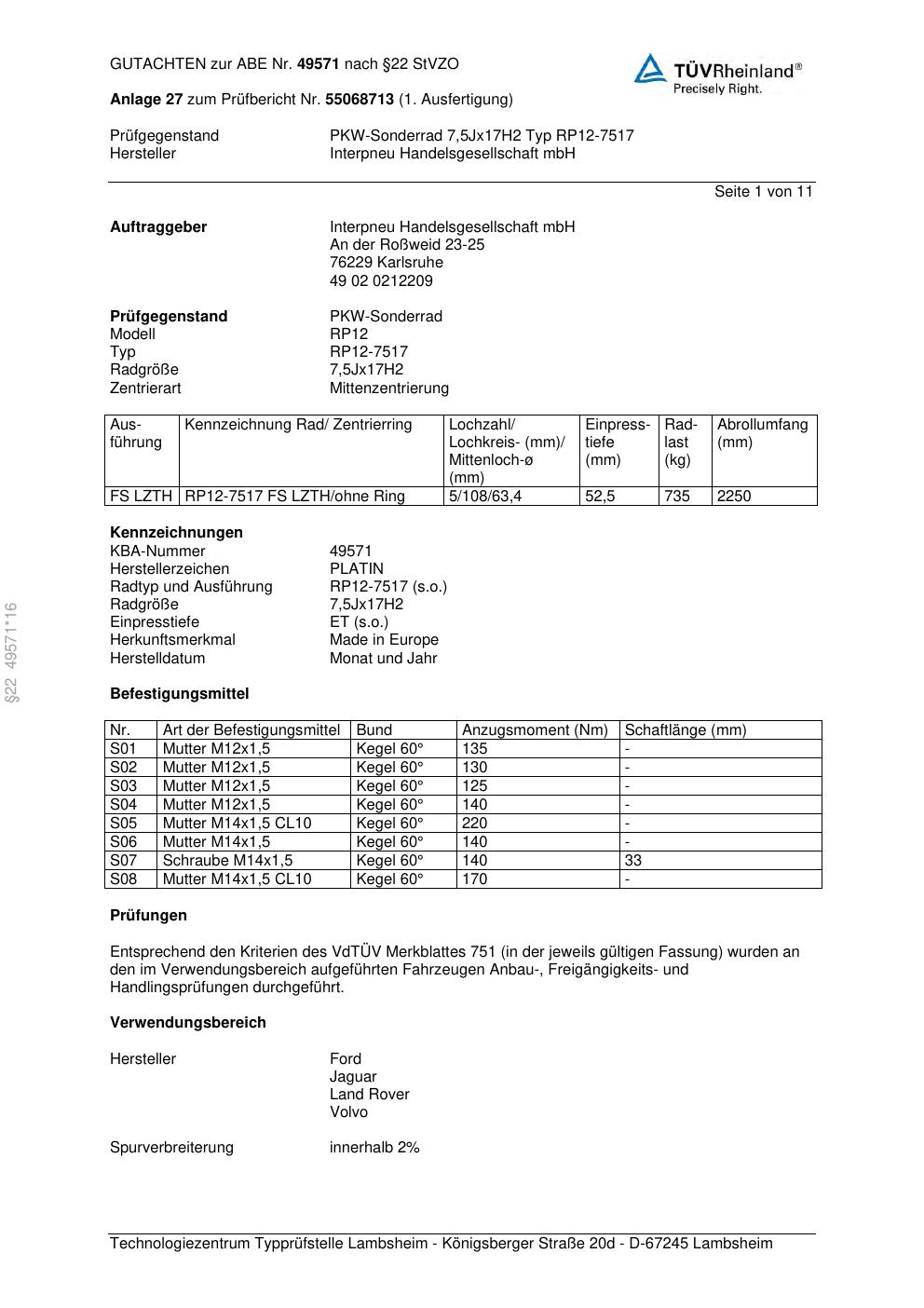 Dieses Gutachten (ABE) bezieht sich auf die Alufelge Platin P69 in der Ausführung 7.5Jx17 ET 0, Mittenloch 0 mm (KBA 49571). Im PDF findest du typischerweise zulässige Reifengrößen, Auflagen/Anbauhinweise und – je nach Dokument – Hinweise zur Eintragung.