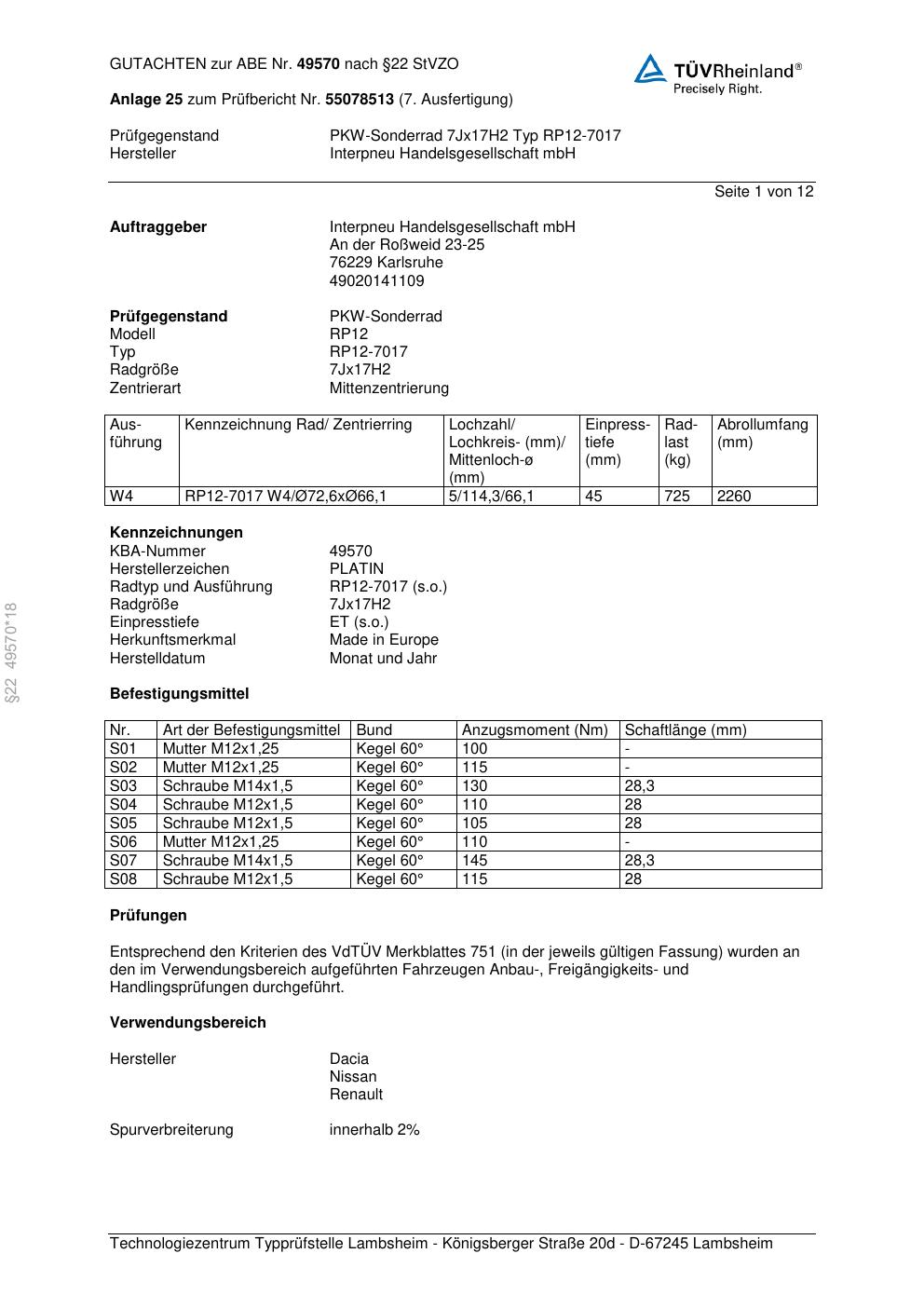 Dieses Gutachten (ABE) bezieht sich auf die Alufelge Platin P69 in der Ausführung 7Jx17 ET 0, Mittenloch 0 mm (KBA 49570). Im PDF findest du typischerweise zulässige Reifengrößen, Auflagen/Anbauhinweise und – je nach Dokument – Hinweise zur Eintragung.