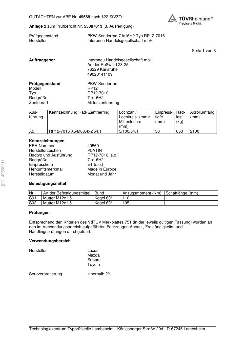 Dieses Gutachten (ABE) bezieht sich auf die Alufelge Platin P69 in der Ausführung 7Jx16 ET 0, Mittenloch 0 mm (KBA 49569). Im PDF findest du typischerweise zulässige Reifengrößen, Auflagen/Anbauhinweise und – je nach Dokument – Hinweise zur Eintragung.