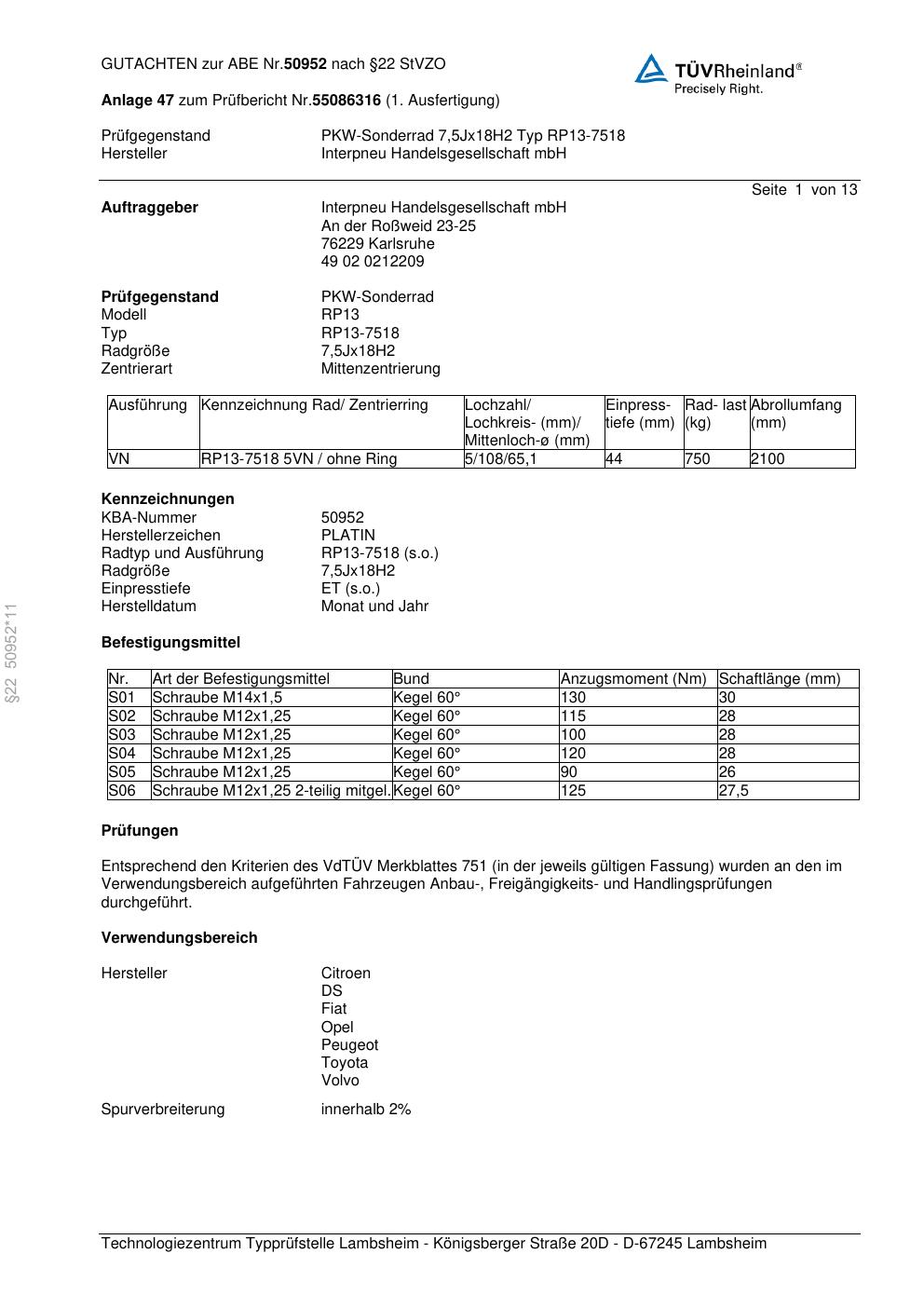Dieses Gutachten (ABE) bezieht sich auf die Alufelge Platin P70 in der Ausführung 7.5Jx18 ET 0, Mittenloch 0 mm (KBA 50952). Im PDF findest du typischerweise zulässige Reifengrößen, Auflagen/Anbauhinweise und – je nach Dokument – Hinweise zur Eintragung.