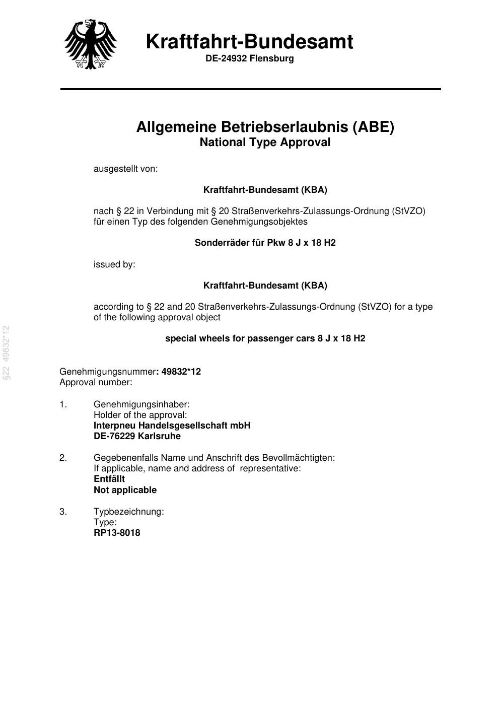 Felgengutachten / ABE für Alufelgen Platin P70 (8Jx18 ET 0, Mittenloch 0 mm) mit KBA 49832 (Zertifikatsnummer 00443081). Hier kostenlos als PDF herunterladen. Der Download-Link ist 24 Stunden gültig und kann bis zu zwei Mal verwendet werden.