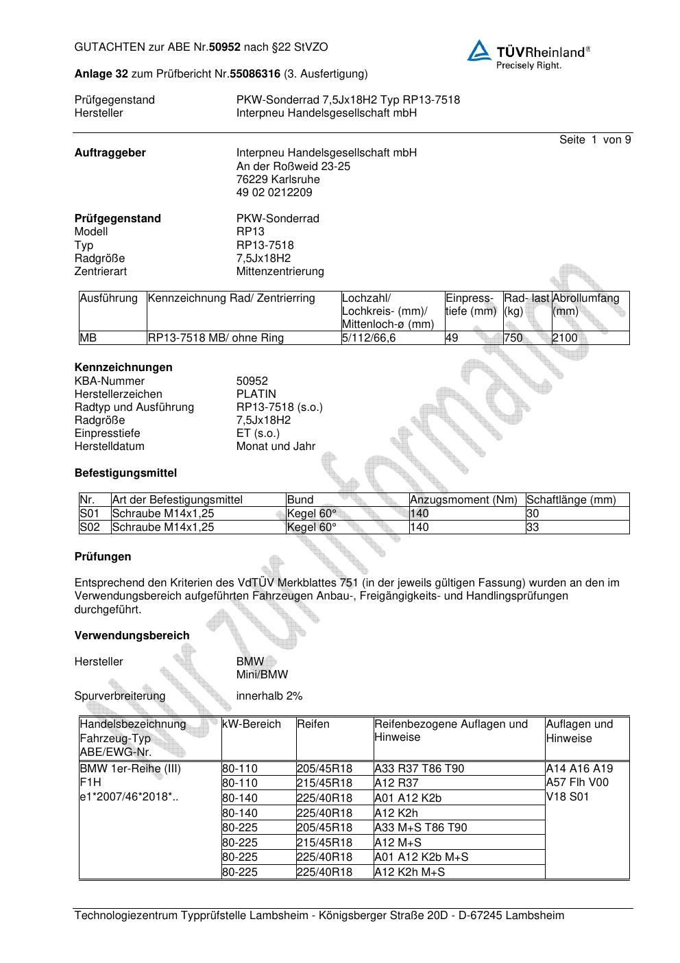Dieses Gutachten (ABE) bezieht sich auf die Alufelge Platin P70 in der Ausführung 7.5Jx18 ET 0, Mittenloch 0 mm (KBA 50952). Im PDF findest du typischerweise zulässige Reifengrößen, Auflagen/Anbauhinweise und – je nach Dokument – Hinweise zur Eintragung.